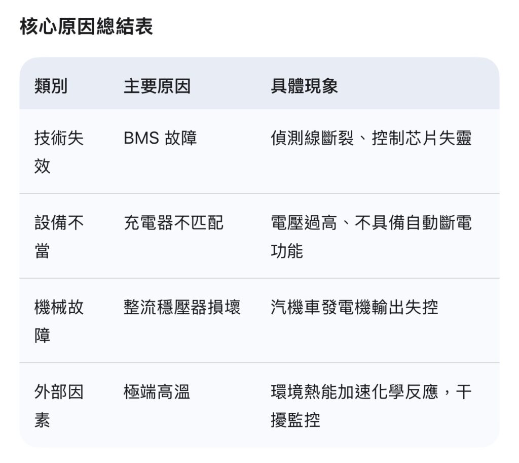 • 損壞現象: 電池冒煙、起火甚至爆炸。
